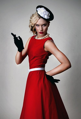 Final purchase: a cherry red satin wiggle dress, a cherry red felt fascinator with bobbles, short black gloves, black suspender and sexy seamed stay-ups and velvet pointy black stilettos. Marilyn, eat your heart out as my gentleman prefers brunettes.