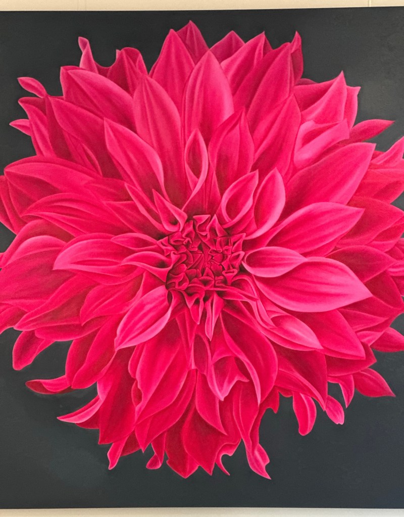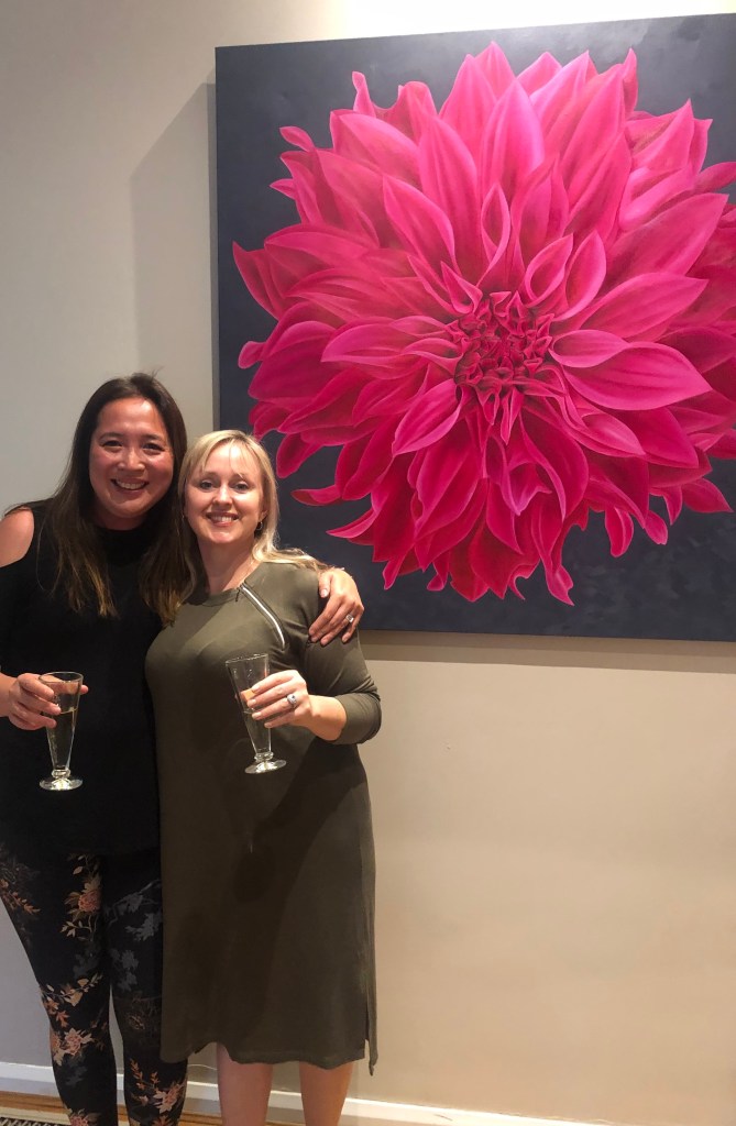 When Tracy hand delivered the finished painting to me, I remember the moment of reveal in great detail. There were gasps, shrieks and silence, wow and wonder as there before me was a single dahlia painted in all of its hot pink fabulousness. One single flower has been painted with depth and movement, and is a great reminder of joie de vivre, echoing the dahlia’s true meaning of devotion, love and dignity. I stare at the painting where it hangs in my office and often get lost in its beauty and in the stillness.