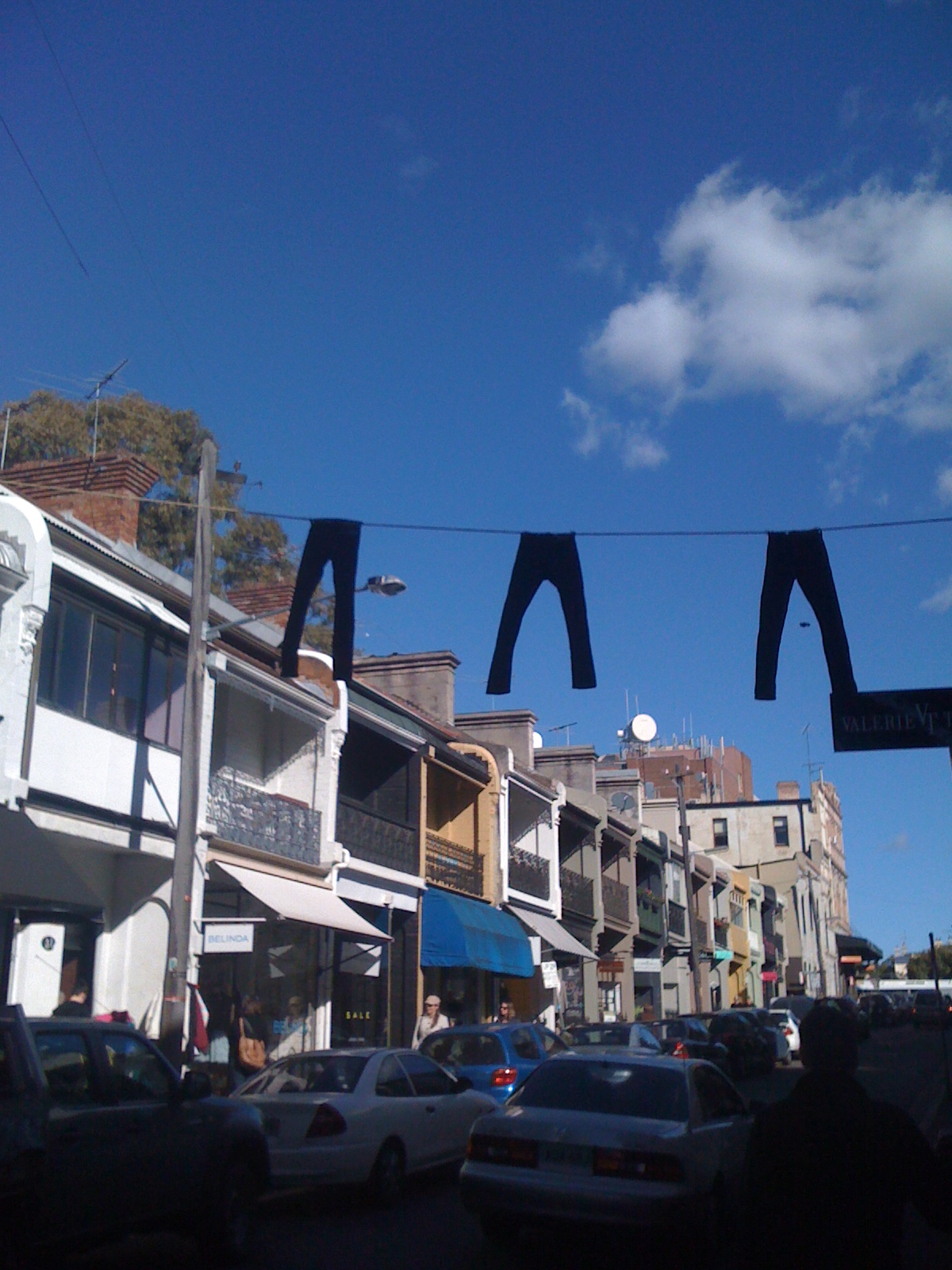 When I have spare time, I often go for a wander down William Street, Paddington in Sydney. Located off the main Oxford Street drag it is home to quaint jewellery and lingerie boutiques and is a renowned treasure trove for lovers of overseas designers such as Marni and DVF. It is also home to my beloved Sami and Sita whilst Collette Dinnigan, Ginger and Smart, Tigerlily, the Corner Shop and another love of mine, Di Nuovo also call this street its home. On one end it’s manned by Paddington Inn and located at the other end is the great people watcher cafe/deli Alimentari. Walking on William Street today, I looked up and noticed something new. With the street’s overhead electric wire resembling more a clothes line in someone’s back yard, Nudie jeans were hanging up to dry directly above the store. I loved its randomness and subtle yet brash branding. A tiny Sydney street suddenly turned into a tourist attraction and I noticed a couple of Japanese tourists clicking away on their digital SLRs at this abstract view on such a usually eloquent street. Love Sydney at this moment!