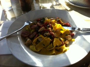 After a short exchange of gossip and a peep and ooh at a sleeping baby, our lunch was ready and laid before us. I had ordered the Saffron Pappardelle and Lizzy had ordered the Homemade Cannelloni. Immediately I was impressed with the generous serving of saffron-tinged pappardelle ribbons accompanied by bite sized chunks of chicken, olives, chorizo and capsicum. The plate was alive with colour and texture and after a sprinkling of freshly cracked pepper, I began to devour it. Meanwhile, Lizzy’s cannelloni had every essence of “homemade” injected in her lunch. Cheese was oozing and bubbling on top and the cannelloni tubes were trying to burst out from underneath the blanket of mozzarella – visibly filled to the brim with a steaming bolognese sauce. Conversation halted and silence emerged between the two of us as lunch was undoubtedly enjoyed and we made a pact to go back!